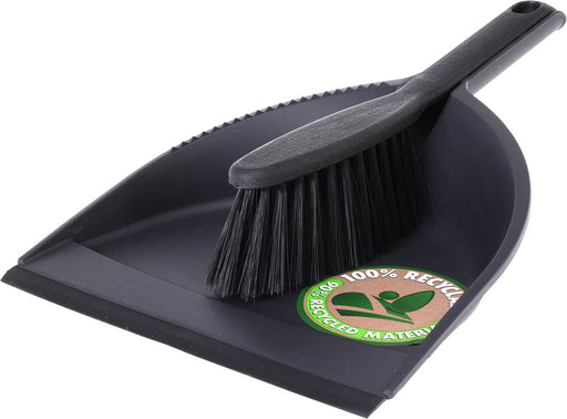 DUSTPAN AND BRUSH. PP. 100 PERCENT RECYCLED MATERIAL, HAIRS AND PP PARTS IN BLACK COLOUR, WEIGHT 120 GRAM, SIZE 32X22XH6CM. EACH PIECE WITH OUR DES...