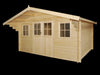 Blokhut met winddichte 3D hoekverbinding. Opgebouwd volgens het klassieke blokhut-principe, in 28mm dik massief Scandinavisch of Siberisch Vurenhout. Met groene roofing.