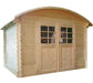 Traditionele blokhut uit gecertificeerd en geïmpregneerd Noord-Europees vurenhout. Dakvorm: gebogen dak. Inclusief een dubbele 'low entry'-deur voorzien van gehard glas en een deurkruk met kindvriendelijk slot, ventilatiekit en dakroofing.