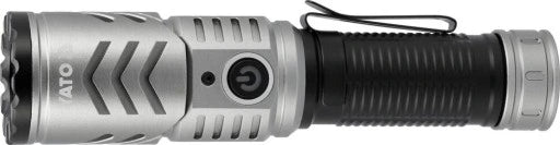 Aan/uit-knop - activeert de zaklamp, verandert de bedrijfsmodi, geeft het batterijniveau aan, het ingedrukt houden van de knop activeert een extreem sterk licht in turbomodus (2500 lm), dat na 30 seconden automatisch overschakelt naar de hoge modus (1500 lm), wat energie bespaart