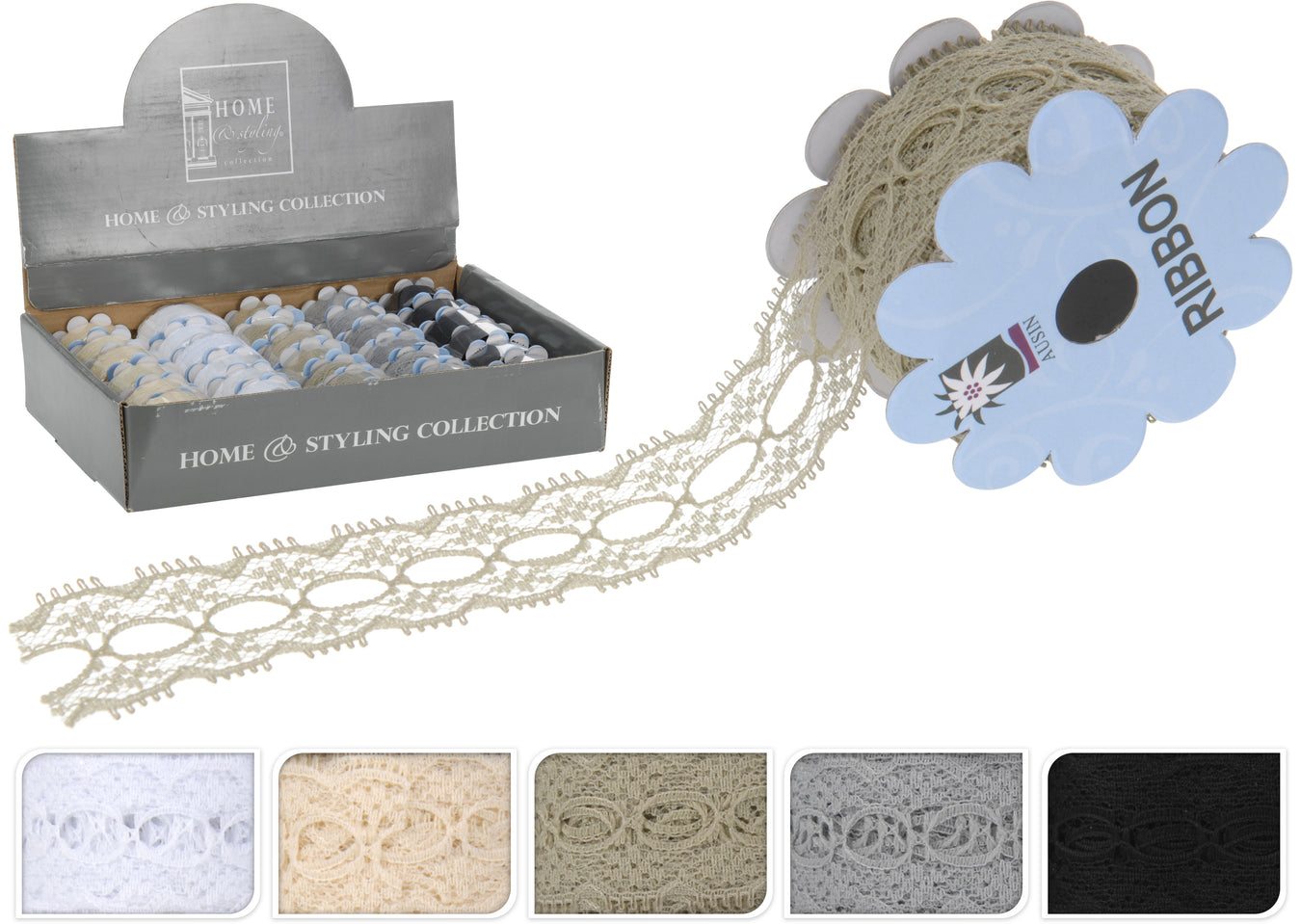Binnen/buitendoos 30/120 stuksKanten lint 5 verschillende kleurenAfmetingen 2,7 cm x 2,5 meter