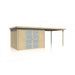 La construction de cet abri de jardin se fait selon le principe de la cabane en rondins. Les parties en bois des murs sont rabotées sur une épaisseur de 19 mm et s'insèrent facilement dans les angles. Cette technologie garantit un abri de jardin très robuste et coupe-vent. L'extension peut être construite aussi bien à gauche qu'à droite. La double porte de cet auvent avec extension garantit toujours un accès facile. La seconde moitié de la porte peut être bloquée si de gros objets doivent être insérés ou retirés. Cet abri est équipé d'une porte sans seuil, ce qui augmente considérablement le confort d'utilisation. La poignée en inox avec serrure cylindrique intégrée ajoute un accent esthétique et qualitatif à l'ensemble. Le jeu de clés permet de verrouiller facilement le rangement. Vous pouvez également verrouiller ou déverrouiller la porte de l’intérieur, sans avoir besoin de clés. Même les enfants qui jouent ne peuvent pas être enfermés à l’intérieur.