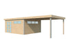 L'abri de jardin moderne Kyoto V de Woodlands offre un look unique et élégant à votre jardin grâce à ses profilés d'angle en aluminium. La construction de cet abri de jardin en épicéa est très simple en glissant les planches dans le profilé en aluminium. Les parties en bois des murs ont été rabotées sur une épaisseur de 28 mm. Cette technologie garantit ainsi un abri de jardin très robuste et résistant au vent. Cet abri de jardin n'est pas livré imprégné. L'extension est idéale comme salon, pool house ou cuisine extérieure pour profiter encore plus de votre jardin ! Vous pouvez bien sûr également l'utiliser pour des raisons pratiques, comme un abri à vélos. Le toit est constitué d'une plaque d'acier avec des plaques isolantes de 30 mm. La double porte garantit un accès facile. La deuxième moitié de porte peut être bloquée si vous devez entrer et sortir avec de gros objets. La poignée en acier inoxydable avec serrure à cylindre intégrée forme un accent esthétique et qualitatif, équipée d'un jeu de clés qui offre la possibilité de fermer complètement le tout. L'abri de jardin peut également être verrouillé ou ouvert de l'intérieur, vous n'avez même pas besoin de clés pour cela. Cela donne un sentiment de sécurité aux enfants qui jouent, rendant impossible de s'enfermer. Le plexiglas apporte beaucoup de lumière et garantit également qu'il n'y a aucune vue sur l'abri de jardin. Tout le matériel nécessaire à la construction de cet abri de jardin est inclus dans le colis avec un manuel clair.