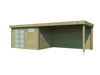 La construction de l'abri de jardin en épicéa Ottawa I de Woodlands suit le principe des cabanes en rondins. Les planches murales en bois sont rabotées sur une épaisseur de 44 mm et s'insèrent facilement dans les coins. Cette technologie garantit un abri de jardin très robuste et coupe-vent. L'extension est idéale comme salon, pool house ou cuisine extérieure pour profiter encore plus de votre jardin ! Bien entendu, vous pouvez également l'utiliser à des fins pratiques, comme par exemple pour ranger des vélos. Le toit de cette belle conception est recouvert de plaques d'acier avec protection anti-condensation.