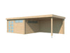 La construction de la maison de jardin en épicéa Ottawa III de Woodlands suit le principe des cabanes en rondins. Les planches murales en bois sont rabotées sur une épaisseur de 44 mm et s'insèrent facilement dans les coins. Cette technologie garantit un abri de jardin très robuste et coupe-vent. L'extension est idéale comme salon, pool house ou cuisine extérieure pour profiter encore plus de votre jardin ! Bien entendu, vous pouvez également l'utiliser à des fins pratiques, comme par exemple pour ranger des vélos. Le toit de cette belle conception est recouvert de plaques d'acier avec protection anti-condensation.