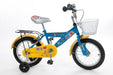 Alu velgen, 2 handremmen, steunwieltjes, mandje voorzien, gesloten kettingkast, kleur : blauw/geel.
